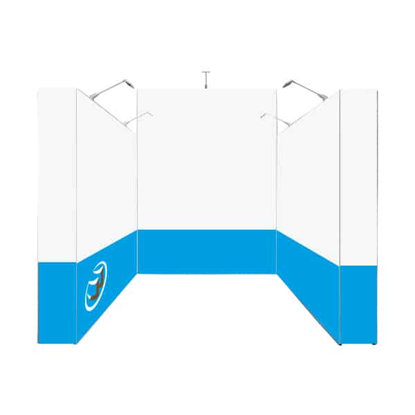 Een volledig modulaire beursoplossing met peesdoek in rondom opstellling waarbij de achterwand hoger is, die in een handomdraai is op te bouwen tot volwaardige beursstand.